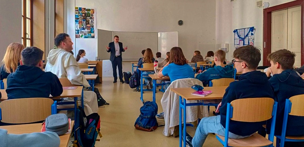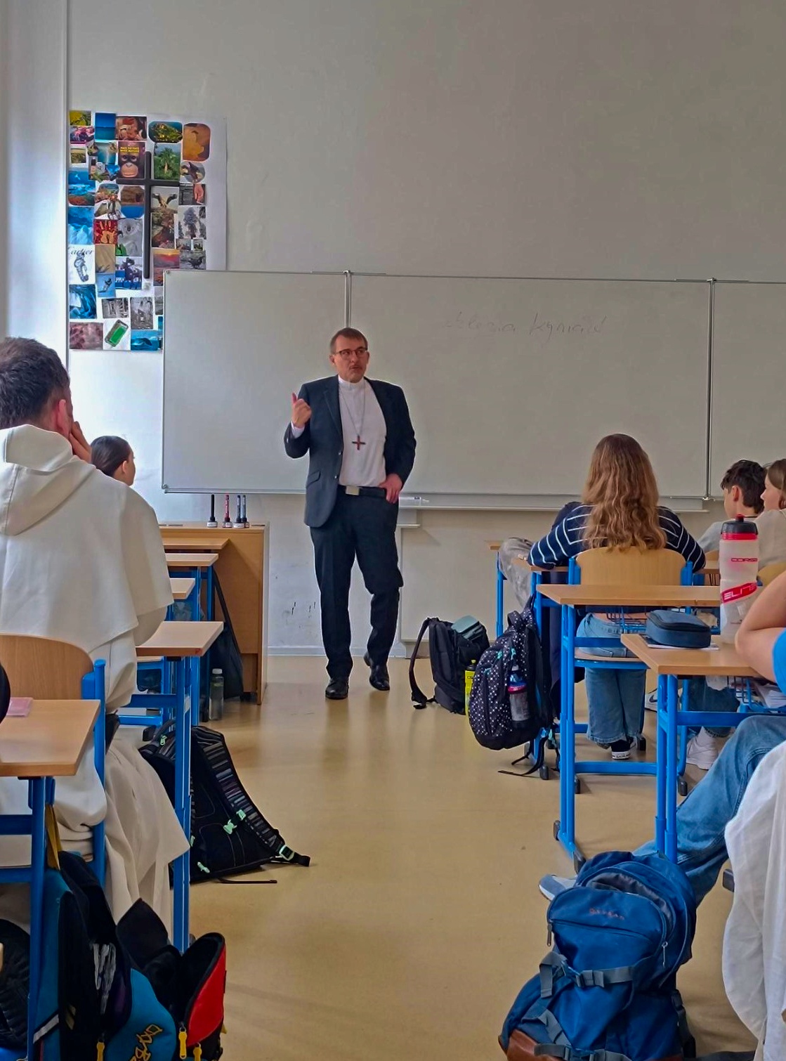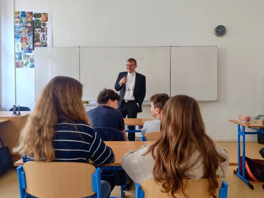 Dne 9. 4. nás potěšil pan biskup Tomáš Holub svojí návštěvou. V obou terciích mu naši žáci kladli otázky, na které vřele odpovídal. Společně jsme se zamysleli, že církev nejsou jen znaky, budovy a loga, ale hlavně lidé. Lidé, kteří se navzájem podporují i mimo svoji bublinu.