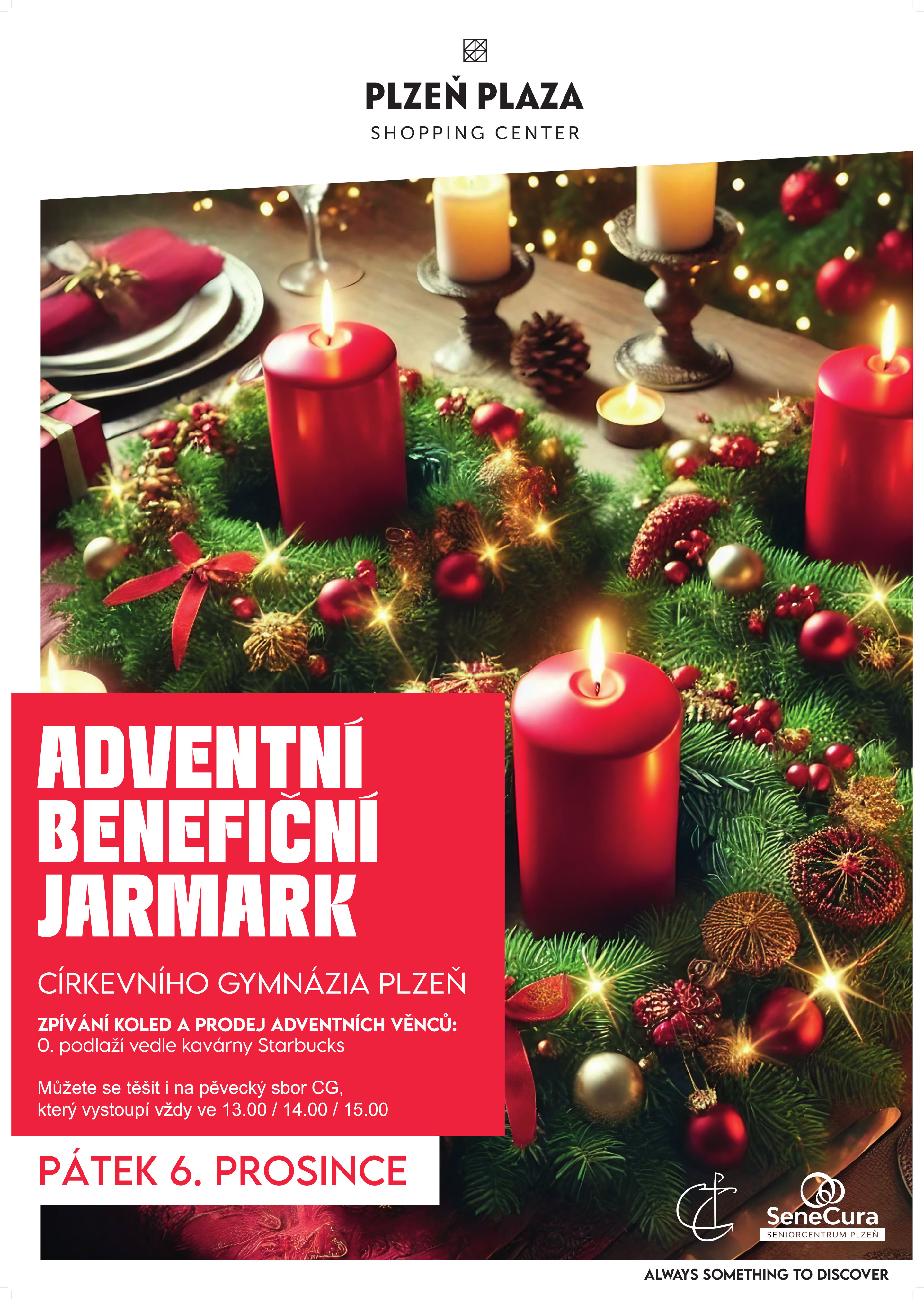 Můžete se těšit na zpívání koled a prodej adventních věnců, pěvecký sbor CG vystoupí v 13.00, 14.00 a v 15.00.